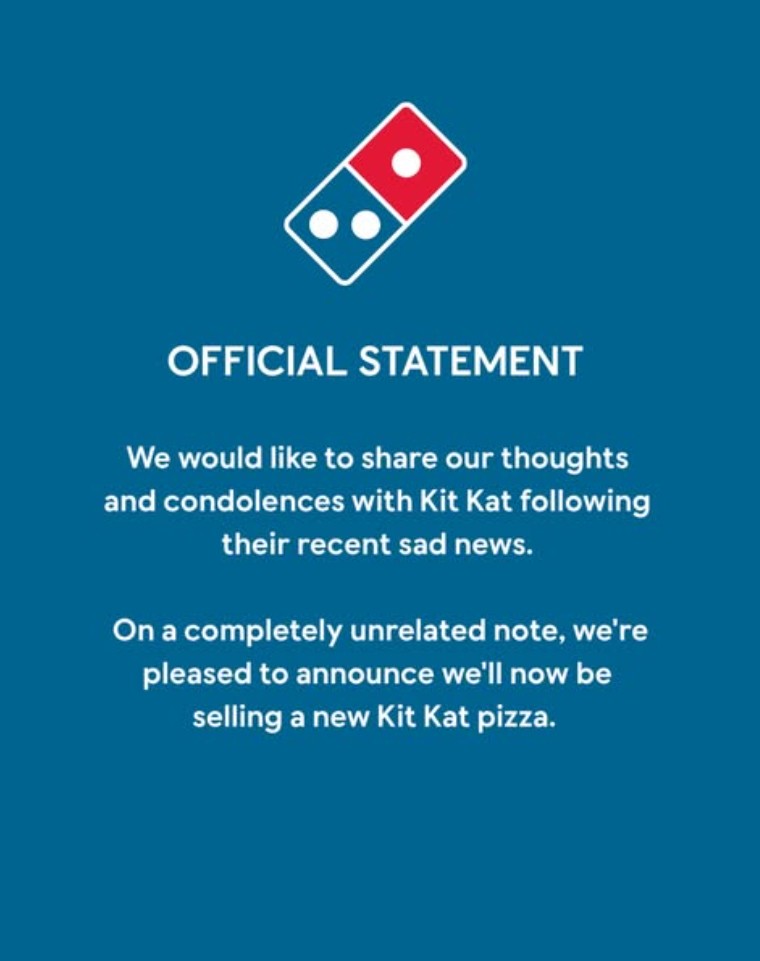 Domino’s issued a mock condolence statement before announcing a completely unrelate KitKat pizza. As one of the first brands to respond, it helped set the tone for what followed.